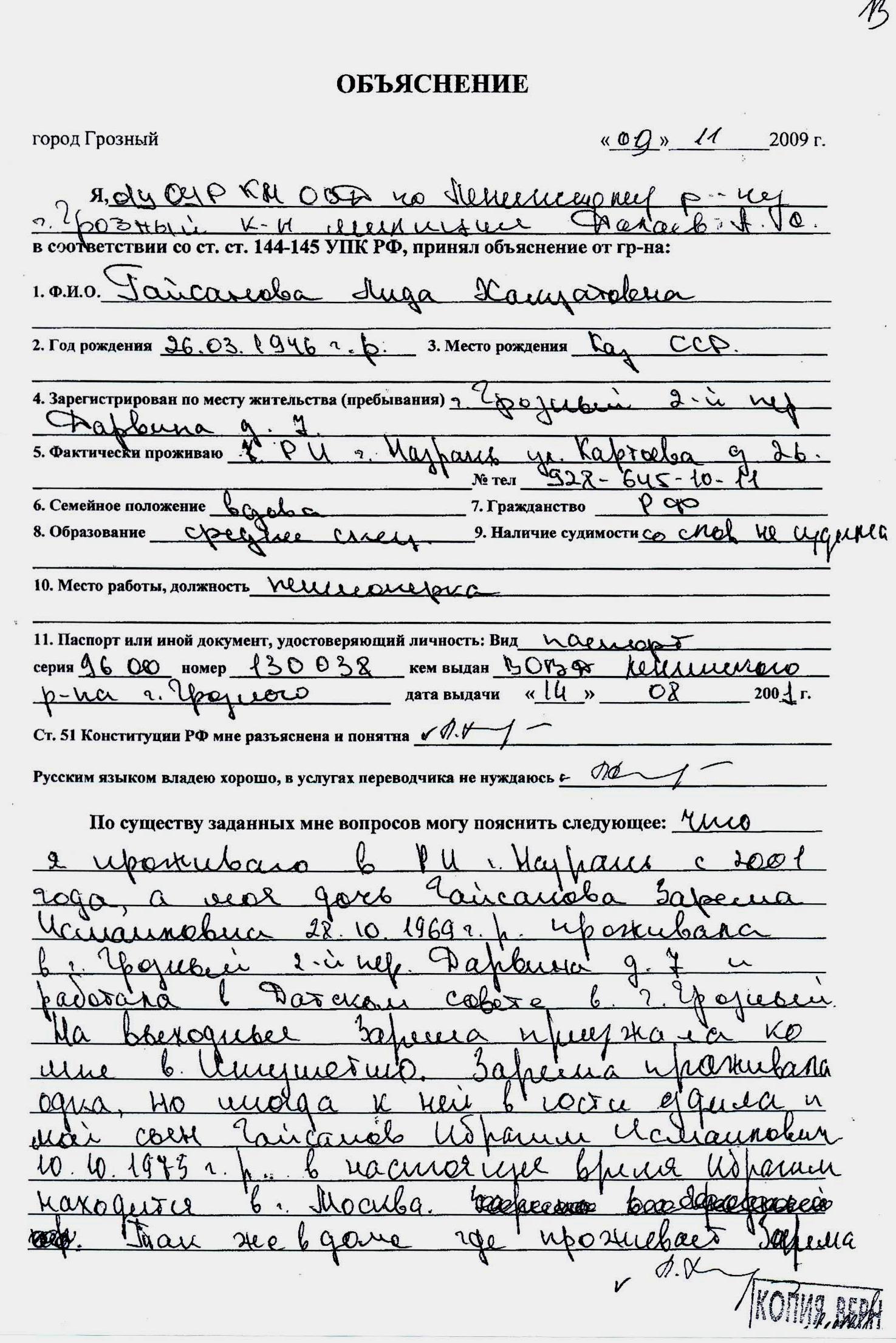 - № 396/03-028 c/o-2009 за подписью руководителя отдела Шалинского межрайонного СО СУ СКП РФ по ЧР С.М.Кучина