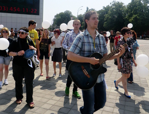Участники мероприятия, среди которых, в основном, молодежь, начали собираться у Дома книги, на улице Красной, в 14.00.