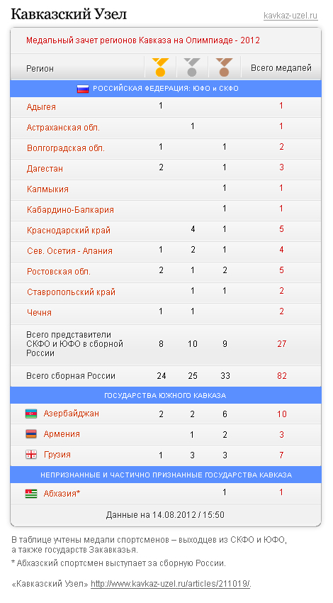 Медальный зачет регионов Кавказа на Олимпиаде - 2012