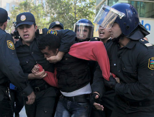 Баку, 20 октября 2012 г. Полиция задерживает участницу акции протеста. Фото Азиза Каримова для "Кавказского узла"Гамбар осудил "неадекватное насилие полиции против активистов на Площади фонтанов". Однако, по его мнению, акция достигла цели.