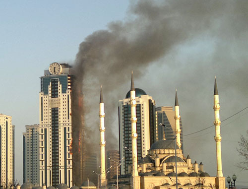 За пожаром в высотном здании комплекса "Грозный-Сити" наблюдают тысячи жителей Грозного. Работники расположенных в центральной части города министерств, служб и ведомств вышли на улицы, многие снимают происходящее на камеры мобильных телефонов и делают фотографии.