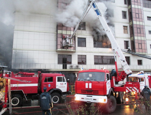 На месте пожара в настоящий момент, по данным МЧС, работают более двухсот человек и более 50 единиц спецтехники.