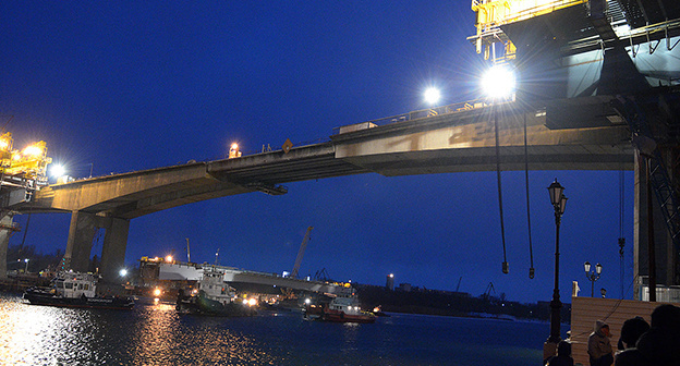 Подъем начнется, как только позволит погода, штатное время подъема пролета составляет четыре часа, проинформировал Голошивец. "Строительство ведется с опережением графика. Сегодня мы уже выполняем объем работ, намеченный на лето следующего года. Если удастся сохранить такие темпы, то в июне 2015 года мы сдадим мост в эксплуатацию", - сказал он.