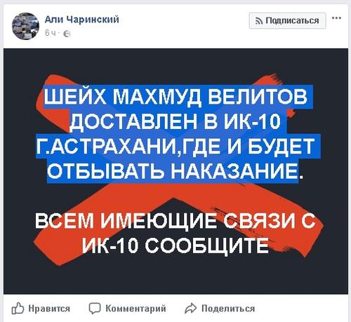 "Шейх Махмуд Велитов доставлен в ИК-10 г.Астрахани, где и будет отбывать наказание", - написал он на своей странице в социальной сети Facebook.
