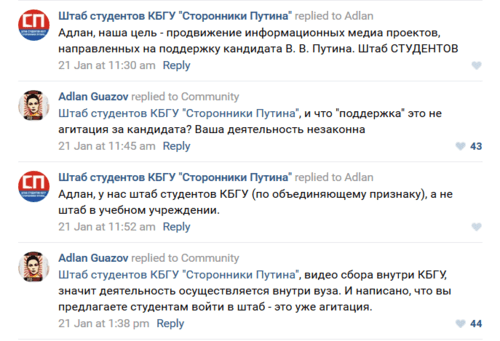 Пользователи социальных сетей, комментировавшие новость о создании штаба студентов КБГУ в поддержку Путина, указали на незаконность политической деятельности и агитации в учебных заведениях. Организатор штаба Георгий Савельев убежден, что нарушения с его стороны не было.