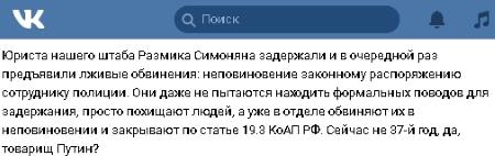 По словам адвоката Михаила Беньяша, задержание произошло около 22:30 16 марта, Симоняну вменяют нарушение ст. 19.3 КоАП России.