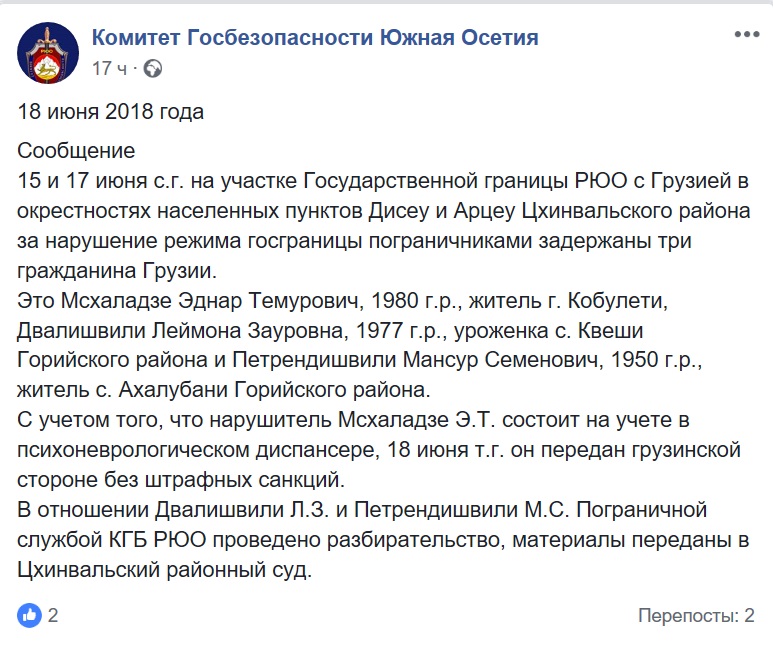 "Это Мсхаладзе Эднар Темурович, 1980 г.р., житель Кобулети, Двалишвили Леймона Зауровна, 1977 г.р., уроженка села Квеши Горийского района, и Петрендишвили Мансур Семенович, 1950 г.р., житель села Ахалубани Горийского района", - говорится в сообщении от 18 июня, опубликованном на странице КГБ Южной Осетии в соцсети Facebook.