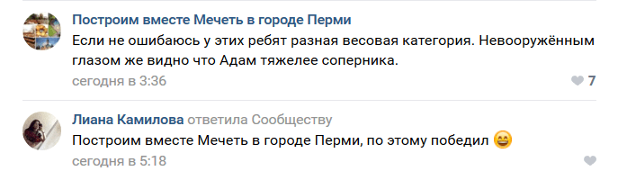 "Если не ошибаюсь, у этих ребят разная весовая категория. Невооруженным глазом же видно, что [сын главы Чечни] тяжелее соперника", - написал в комментарии к видео пользователь "Построим вместе Мечеть в городе Перми". "Поэтому и победил", - заключила в ответном комментарии Лиана Камилова.