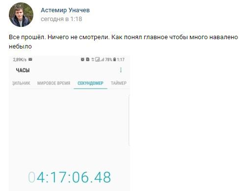 Астемир Уначев опубликовал фото секундомера, на котором значится, что он прошел границу за 4 часа 17 минут. "Понятна причина пробки. Каждый пакет смотрят. Работают восемь окон на въезд и одно на выезд из страны", - пояснил он работу российских таможенников.