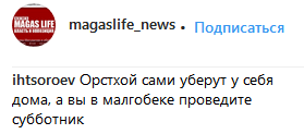 "Орстхой сами уберут у себя дома, а вы в Малгобеке проведите субботник", - прокомментировал призыв к субботнику пользователь Instagram под ником ihtsoroev.