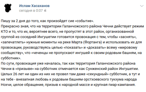"Организованной группой из соседней Ингушетии готовится провокация с тем, чтобы "заснять", "запечатлеть" нужные моменты на реке Марта (Фортанга) и использовать их для провокации, руководствуясь целью "показать" и "доказать" всему "мировому сообществу", что "чеченцы не пропускают ингушей к своим родовым башням на субботник". По сути, провокация уже началась, так как территория Галанчожского района Чечни в "призыве" на субботник отмечается как Сунженский район Ингушетии. Целых 26 лет ни один из них не провел там даже "секундный" субботник, а тут и на тебе - внезапная любовь к родовым башням орстхоевского тукхума народа Нохчи, целое обращение, призыв к народной массе и крупная пиар-кампания", - написал минувшей ночью Ислам Хасаханов на своей странице в соцсети.