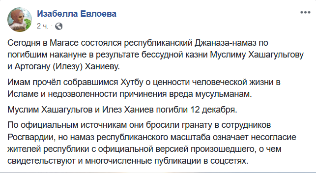 "Сегодня в Магасе состоялся республиканский Джаназа-намаз (поминальная молитва. - Прим. "Кавказского узла") по погибшим накануне в результате бессудной казни Муслиму Хашагульгову и Артогану (Илезу) Ханиеву. Имам прочел собравшимся Хутбу о ценности человеческой жизни в Исламе и недозволенности причинения вреда мусульманам", - написала журналистка Изабелла Евлоева на своей странице в Facebook.