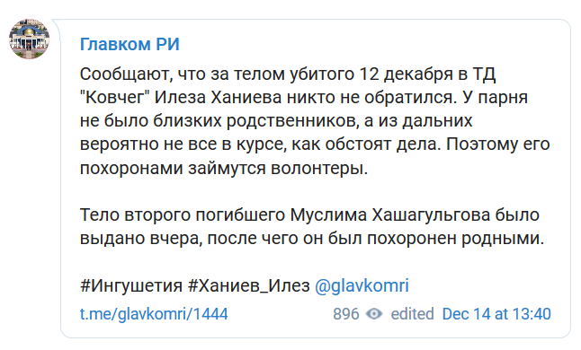 "За телом убитого 12 декабря в ТД "Ковчег" Илеза Ханиева никто не обратился. У парня не было близких родственников", - говорится в сообщении Telegram-канала "Главком РИ".
