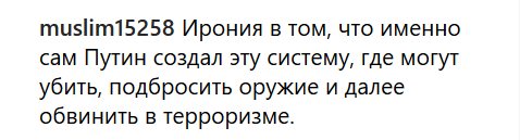 "Ирония в том, что именно сам Путин создал эту систему, где могут убить, подбросить оружие и далее обвинить в терроризме", - заявил muslim15258.