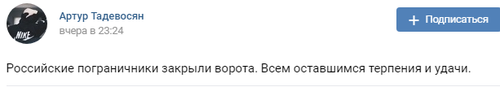 "Российские пограничники закрыли ворота. Всем оставшимся терпения и удачи", - подтвердил около 23.00 мск 15 января в группе "Верхний Ларс" в соцсети "ВКонтакте" пользователь Артур Тадевосян.