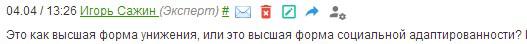 "Это как высшая форма унижения, или это высшая форма социальной адаптированности?" - задался вопросом там же Игорь Сажин.