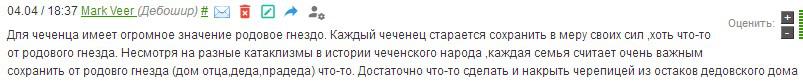 "Для чеченца имеет огромное значение родовое гнездо. Каждый чеченец старается сохранить в меру своих сил хоть что-то от родового гнезда. Несмотря на разные катаклизмы в истории чеченского народа, каждая семья считает очень важным сохранить от родового гнезда (дом отца, деда, прадеда) что-то […] Этот снос в Шалях, Курчалое и других населенных пунктах нам показывает, насколько низко пал чеченский дух, насколько пренебрежительно к своей истории относятся современные чеченцы. […] на чужих землях построить какой-то парк. Это за пределами всех рамок", - написал сегодня читатель под ником Mark Veer под новостью на "Кавказском узле".