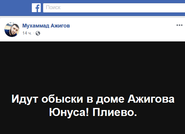 Пользователь Мухаммад Ажигов утром 11 апреля написал в Facebook, что обыски идут и у жителя Плиева Юнуса Ажигова, но о задержании активиста не сообщалось.