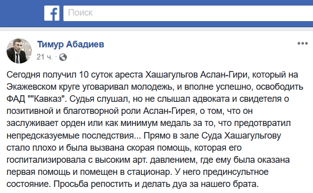 Также 10 апреля суд арестовал Аслан-Гирея Хашагульгова. В зале суде Хашагульгову стало плохо из-за гипертонии, его отвезли в больницу.
