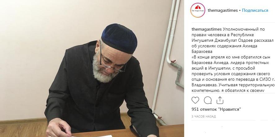 "В конце апреля ко мне обратился сын Барахоева Ахмеда с просьбой проверить условия содержания своего отца и основания его перевода в СИЗО г.Владикавказа. Учитывая территориальную компетенцию, я обратился к своему коллеге из Северной Осетии, который сегодня его посетил в СИЗО", - цитирует Оздоева издание The Magas Times на своей странице в Instagram.