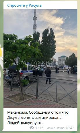 О том, что из мечети в Махачкале эвакуировали посетителей, сообщил и Telegram-канал "Спросите у Расула". В 18.42 мск здесь размещена фотография, на которой видно, что у мечети стоит полицейский автомобиль, а рядом несколько полицейских. На видео, размещенном в 18.47 мск, у мечети видны также полицейские машины с мигалками и большое количество силовиков.