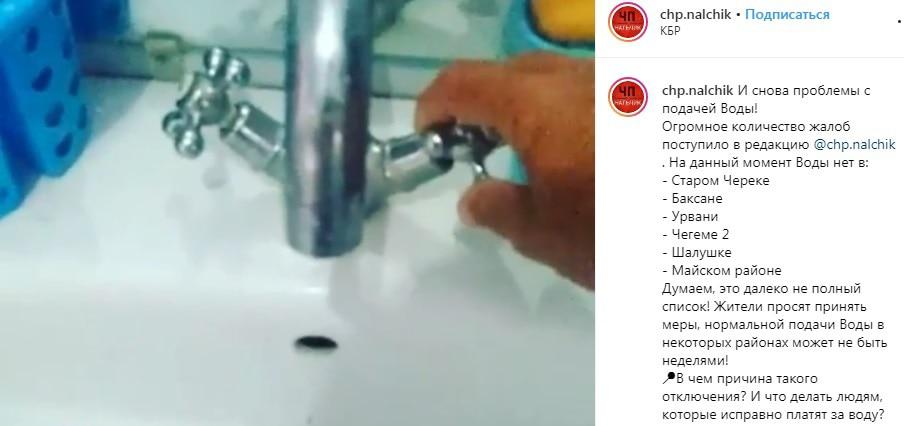 Жалобы на отсутствие воды либо о проблемах с ее подачей поступили от жителей Старого Черека, Урвани (Урванский район), Чегема Второго, Шалушки (Чегемский район), Баксана и Майского района, сообщило сегодня сообщество chp.nalchik в Instagram.