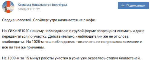 О нарушениях сообщил и штаб Алексея Навального в Волгограде. "Утро начинается не с кофе. На УИКе №1020 нашему наблюдателю в грубой форме запрещают снимать и даже передвигаться по участку... На 1028-м наш наблюдатель тоже очень не понравился комиссии, и всё по тем же причинам. На 1809-м за 15 минут работы участка в урне уже оказалась стопка бюллетеней", - говорится в публикации на странице штаба в соцсети "ВКонтакте".