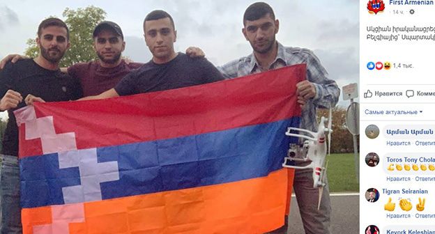 Ответственность за вылет дрона взяла на себя группа ультрас "Первого армянского фронта". "Акцию провели наши ребята из Бельгии", - говорится в сегодняшней публикации на странице First Armenian Front /FAF ultras/ в соцсети Facebook (перевод "Кавказского узла"). На фотографии, которой сопровождается публикация, четыре человека держат в руках флаг Нагорного Карабаха и дрон. По состоянию на 14.30 мск 4 октября, эта публикация собрала 1,4 тысячи "лайков", ее перепостили 121 раз.