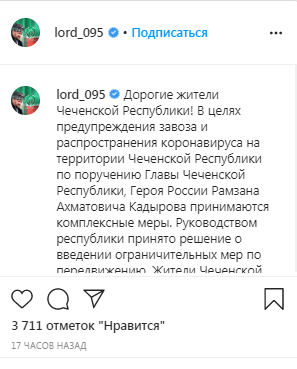 "Временно ограничивается въезд в город Грозный", - сообщил 28 марта на своей странице в Instagram председатель парламента Чечни Магомед Даудов.