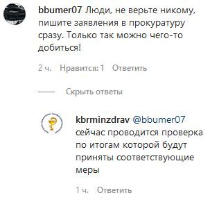 Пользователь bbumer07 предложил участникам обсуждения обращаться в надзорное ведомство. "Люди, не верьте никому, пишите заявления в прокуратуру сразу. Только так можно чего-то добиться!" – написал он. "Сейчас проводится проверка, по итогам которой будут приняты соответствующие меры", - ответил на это сообщение представитель Минздрава Кабардино-Балкарии.