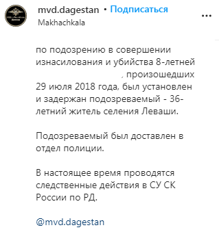 "По подозрению в совершении изнасилования и убийства восьмилетней [девочки] 29 июля 2018 года был установлен и задержан подозреваемый - 36-летний житель селения Леваши", - сообщило 18 октября МВД по Дагестану на своей странице в Instagram. Подозреваемого доставили в отдел полиции, отмечает ведомство.