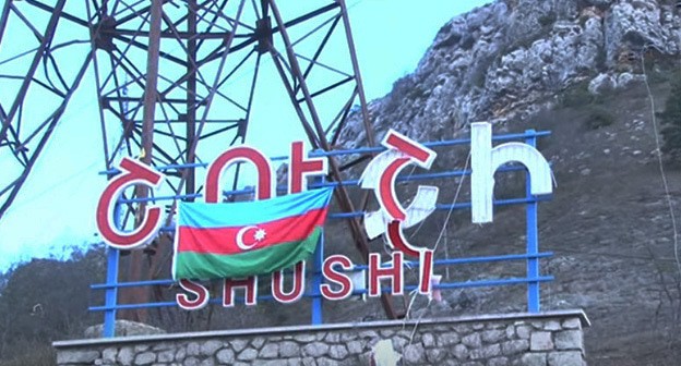 Азербайджанский флаг на административном здании в Шуши. Скриншот из видео на YouTube-канале Минобороны Азербайджана. https://www.youtube.com/watch?v=So7e9mRblfYВидеозапись из города Шуша Министерство обороны Азербайджана опубликовало сегодня на своем сайте и  YouTube-канале. На первых кадрах видео запечатлен азербайджанский флаг, вывешенный на мемориальном знаке с названием города на въезде в населенный пункт. На видео затем видны частные и многоэтажные дома, а также исторические сооружения. Все улицы пусты, на них нет людей. Также на видео снято, как азербайджанский флаг устанавливает на четырехэтажном здании, похожем на административное, солдат и отдает честь. Затем у этого здания стоят военные и отдают рапорт на азербайджанском языке.