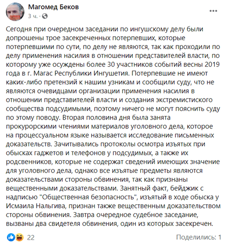 Адвокат Магомед Беков также отметил, что сотрудник Росгвардии, допрошенные в суде "потерпевшими, по сути, по делу не являются, так как проходили по делу применения насилия в отношении представителей власти, по которому уже осуждены более 30 участников событий весны 2019 года в Магасе".