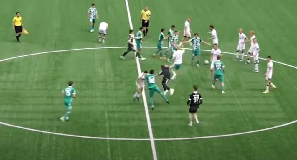 Игрок "Локомотива" убегает от трех игроков "Ахмата". Стоп-кадр видео https://t.me/bazabazon/7007Видео драки опубликовал сегодня Telegram-канал Baza. В кадре судья свистит и подходит к игроку "Ахмата", показывая штрафную карточку. Игрок идет навстречу и, находясь рядом с судьей, делает резкое движение в его сторону, а затем разворачивается. За кадром раздаются и уже не стихают громкие крики болельщиков. Футболисты "Ахмата" собираются вокруг судьи, туда же подходят игроки "Локомотива". Москвичей начинают толкать, причем один из игроков "Локомотива" убегает, отрываясь от трех преследователей. Другой футболист столичной команды оказывается один между игроками "Ахмата" и получает несколько ударов.