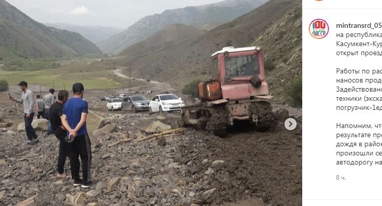 Дорожные рабочие организовали проезд по временной схеме по заблокированной селем дороге, работы по расчистке селевых наносов продолжаются, отчиталось ведомство. "Задействовано три единицы дорожной техники – экскаватор, погрузчик и бульдозер", – говорится в сообщении на странице Министерства транспорта и дорожного хозяйства в Instagram.