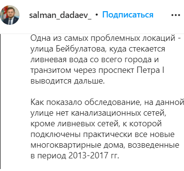 Административно-технической инспекции дано поручение обследовать подтопленные улицы и выявить причины подтоплений, написал 7 октября мэр города Салман Дадаев на своей странице в Instagram, насчитывающей 87,4 тысячи подписчиков.