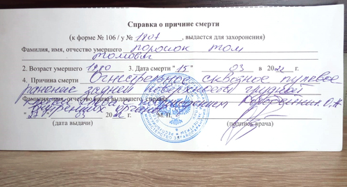 Причиной смерти Тома Поросюка стало огнестрельное сквозное пулевое ранение задней поверхности грудной клетки с повреждением внутренних органов, сказано в справке о причине смерти (копия имеется в распоряжении "Кавказского узла"). Согласно врачебному свидетельству (копия имеется в распоряжении "Кавказского узла"), смерть наступила в результате военной операции. Военный билет Тома Поросюка выдан отделом военного комиссариата ДНР по Пролетарско-Буденновскому отделу 12 сентября 2018 года (копия имеется в распоряжении "Кавказского узла").