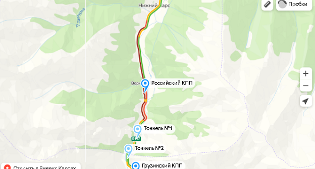 Согласно изображению с веб-камер на КПП "Верхний Ларс", на 09.55 мск, на российском контрольно-пропускном пункте видны очереди из легковых и грузовых машин. Изображение с камеры на противоположной стороне дороги отсутствует. Интерактивная карта пробок показывает, что на Военно-Грузинской дороге образовался сильный затор. Данные веб-камер обновляются каждые пять минут, говорится в публикации на сайте "Край земли".