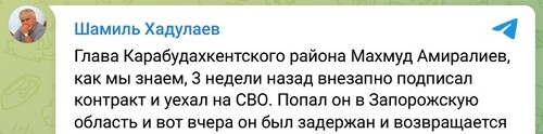 Махмуд Амиралиев "три недели назад внезапно подписал контракт и уехал на СВО", сообщил 5 июля в своем телеграм-канале председатель Общественной наблюдательной комиссии Дагестана Шамиль Хадулаев. "Попал он в Запорожскую область, и вот вчера он был задержан и возвращается назад", - написал он.