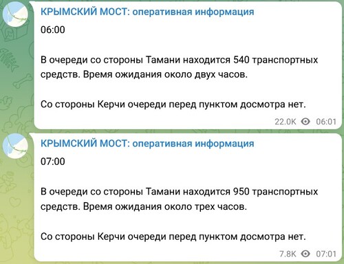 Согласно ежечасным публикациям, ночью и в 04.00 мск очередей перед мостом не было, а в 05.00 мск в очереди со стороны Тамани стояли уже 350 машин. В 06.00 мск очередь выросла до 540 машин. Со стороны Керчи очереди не наблюдалось.