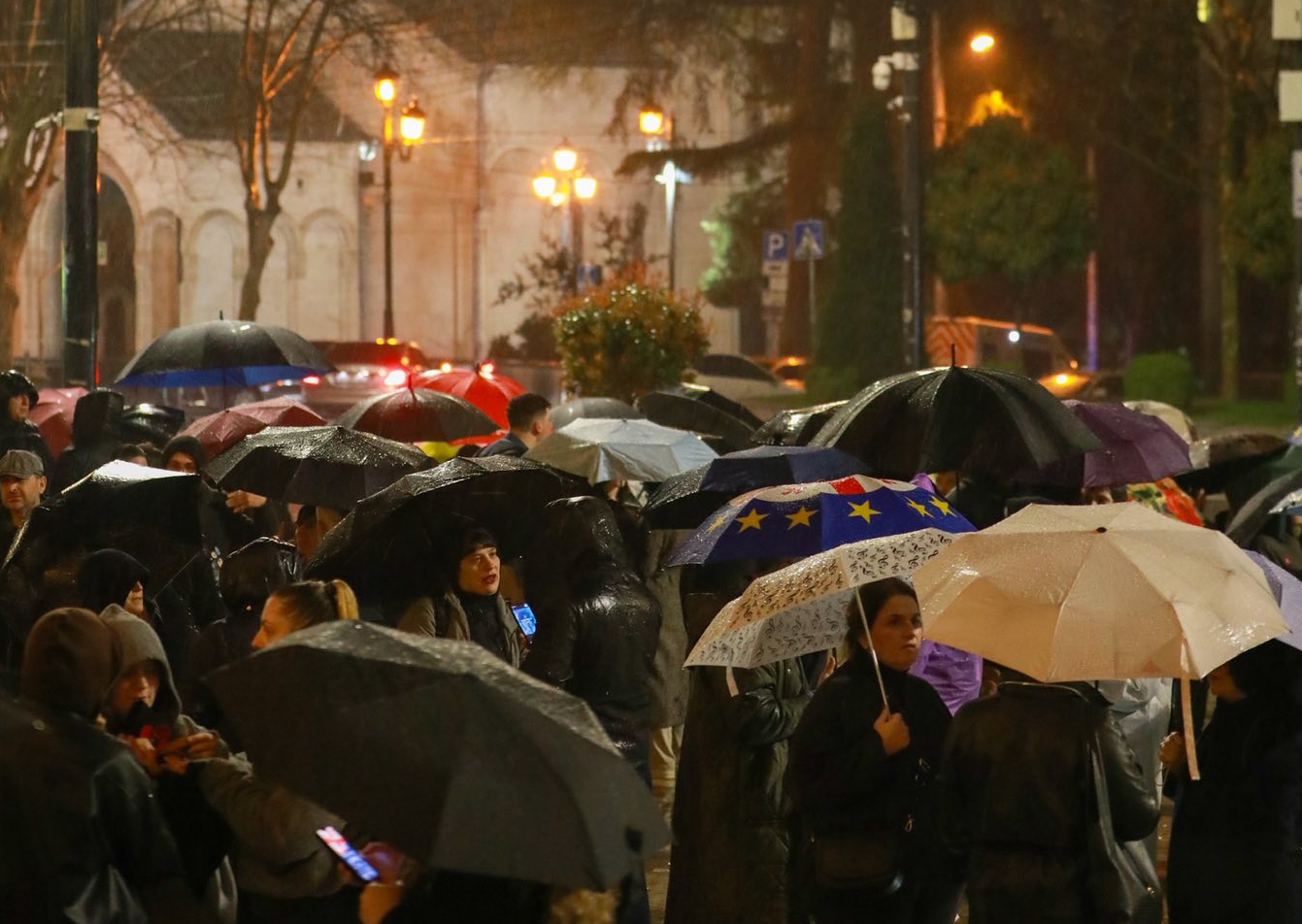 Несмотря на дождь в столице Грузии, протестующие пришли на акцию с национальными флагами и флагами Евросоюза, у некоторых активистов были также флаги Украины и США. Несколько человек принесли плакаты с надписями: "Все равно не признаем, уходите", "Полиция должна защищать права и основные свободы граждан", следует из публикаций фотографа Mo Se и грузинских медиа в Facebook*.