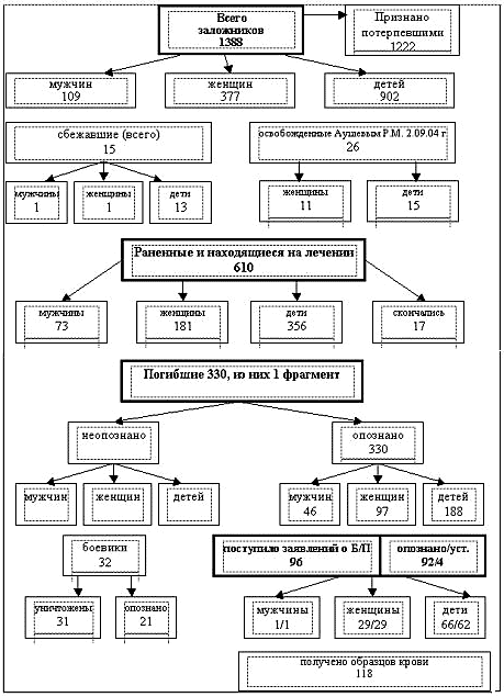 Всего в результате террористического акта в заложники было взято 1388 человек, погибли 331 человек (в том числе скончавшаяся в августе 2005 г. в больнице Жукаева М.К.), из них 318 заложников, житель Беслана не из числа заложников, 2 сотрудника МЧС РФ и 10 сотрудников ЦСН ФСБ РФ. Ранения различной степени тяжести получили 783 человека, из них 728 заложников и жителей Беслана, а также 55 сотрудников ЦСН, МВД и военнослужащих. В качестве потерпевших признано 1343 человека. Ущерб, причиненный в результате теракта школе и близлежащим зданиям, составил более 20 млн.рублей. Размер же морального и материального ущерба, причиненного в целом, и в первую очередь людям, вряд ли поддается подсчету.