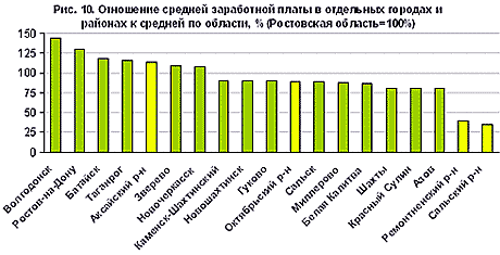 Рис. 10. Отношение средней заработной платы в отдельных городах и районах к средней по области (Ростовская область=100%)