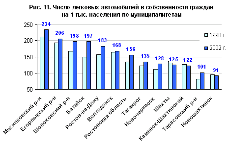 Аутсайдерами по обоим косвенным показателям являются депрессивные угледобывающие города и прилегающие к ним районы (Шахты, Каменск-Шахтинский, Новошахтинск, Гуково, Миллеровский, Тарасовский районы), расположенные на севере области. Обеспеченность автомобилями в угольных городах почти на треть ниже средней по области и даже сократилась за годы экономического роста, что говорит о степени депрессивности. Немногим лучше показатели городов с машиностроительной специализацией – Азова, Таганрога, Новочеркасска. Последние два города относятся к крупным (с населением 170—280 тыс. человек), но в них так и не сформировались альтернативные источники занятости и доходов на базе развитой торговли и других отраслей сектора услуг. Дело в том, что Ростов-на-Дону, как и Москва в Центральной России, подавляет окружающие города, стягивая все доходные сервисные функции на себя.
