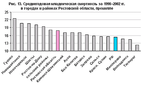 Рис. 13. Среднегодовая младенческая смертность за 1998—2002 гг. в городах и районах Ростовской области