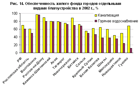 Острейшая проблема Ростовской области, как и почти всех регионов Юга – низкое качество городской среды. Из-за высокой доли индивидуального жилищного фонда многие города не отличаются от сельской местности по благоустройству и обеспеченности разными видами услуг. В некоторых крупных городах с населением свыше 100 тыс. человек обеспечено телефоном меньше половины семей (Батайск), а в городах социально запущенного шахтерского Донбасса – только 13—26% (Шахты, Новошахтинск). В средних городах с населением около 50 тыс. человек уровень телефонизации порой ниже, чем в сельских районах (Красный Сулин, Белая Калитва – 8—11%). Даже Ростов имеет низкую телефонизацию для города-"миллионера" (менее 60% семей), но все же в нем 5% населения стабильно пользуются Интернетом. В этом отношении город выглядит "островом модернизации" на фоне полусельской коммуникационной среды остальных городов. В половине городов Ростовской области показатели благоустройства жилья хуже средних по России, рассчитанных для всего населения, включая сельское. Единственным полностью благоустроенным городом является молодой Волгодонск, построенный в 1970-е годы при создании "Атоммаша". Социальная запущенность шахтерских городов видна и по минимальному уровню благоустройства жилищного фонда в Шахтах, Новошахтинске и Гуково (рис. 14).