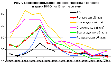 По сравнению с Краснодарским и Ставропольским краями миграционное давление в Ростовской области было в переходный период менее сильным и примерно схожим с областями южного Поволжья. Пиковый период миграций пришелся на 1993—1994 гг., в последние годы коэффициент миграционного прироста в области минимален (рис. 1). Как и в других южных регионах, в области произошла смена состава мигрантов: волна возвратных миграций русского населения из стран СНГ стала постепенно замещаться миграциями коренного населения республик Северного Кавказа и стран Закавказья.