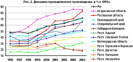 В советское время Ростовская область была самым индустриальным регионом Северного Кавказа, специализируясь на машиностроении (крупнейший в стране завод по производству комбайнов "Ростсельмаш", Таганрогский завод "Красный котельщик", авиастроительный и трубный заводы, Новочеркасский электровозостроительный завод, Волгодонский "Атоммаш"). Обвальное сокращение спроса на эту продукцию в переходный период стало причиной сильнейшего спада, к 1996 г. в области осталась только треть от объемов промышленного производства 1990 г. (рис. 2). В годы после дефолта Ростовская область имела самые высокие темпы роста на юге страны благодаря подъему импортозамещения, особенно пищевой промышленности. В результате в 2004 г. промышленное производство достигло 83% от уровня 1990 г., более высокие показатели в ЮФО имеет только газодобывающая Астраханская область.