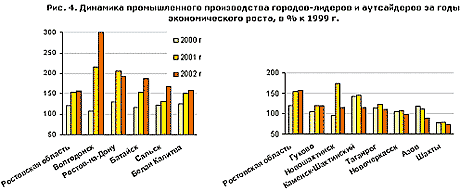 Экономическая ситуация в городах Ростовской области очень разная, что подтверждает динамика промышленного производства в годы экономического роста (рис. 4). Самым устойчивым оказался Волгодонск, темпы роста его промышленности максимальны. Города пищевой промышленности, особенно пригород Ростова Батайск, также растут уверенно. Но более чем в половине городов области в 2002 г. отмечался спад или стагнация производства, причем среди них не только все угольные города, но также депрессивный Азов (судостроение) и крупные многопрофильные промышленные центры – Таганрог и Новочеркасск.
