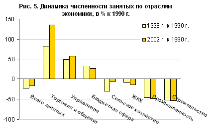 Уровень экономической активности населения Ростовской области и в советское время, и в переходный период был ниже среднего по стране. В 2002 г. 62% населения относилось к экономически активному, в среднем по России – 65%. Пониженной активностью отличаются все регионы Северного Кавказа, так как в них выше доля сельского населения и занятость в личном подсобном хозяйстве. По динамике занятости Ростовская область схожа со среднероссийским трендом: численность занятых сокращалась до 1998 г., а после дефолта начался ее рост. В отраслевом разрезе максимальное сокращение произошло в промышленности и строительстве, наиболее сильный рост – в торговле, выросла также занятость в управлении и бюджетной сфере (рис. 5). Специфична только динамика занятости в сельском хозяйстве: если в большинстве регионов Юга она непрерывно росла, аккумулируя мигрантов, то в Ростовской области рост возобновился только после дефолта, а в середине 1990-х годов занятость в агросекторе сокращалась. Вероятно, это связано с более сильным оттоком занятых из сельского хозяйства в другие отрасли экономики и личное подсобное хозяйство (ЛПХ) в наихудшие для сельского хозяйства годы.